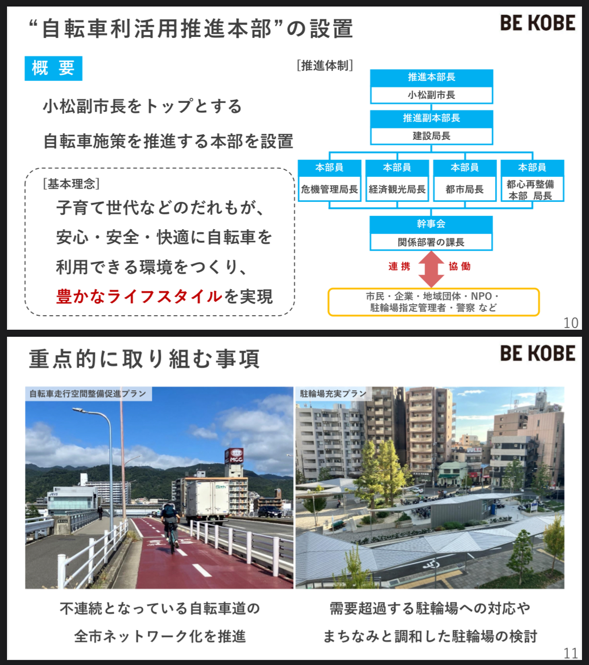 そのため、「自転車利活用推進本部」を設置し、データの活用や地域・企業・警察などと連携しながら、神戸市民に身近である自転車の利活用施策を強力に推進し、子育て世代など、だれもが安全・安心・快適に自転車を利用できる環境をつくり、「豊かなライフスタイル」の実現を図ります。