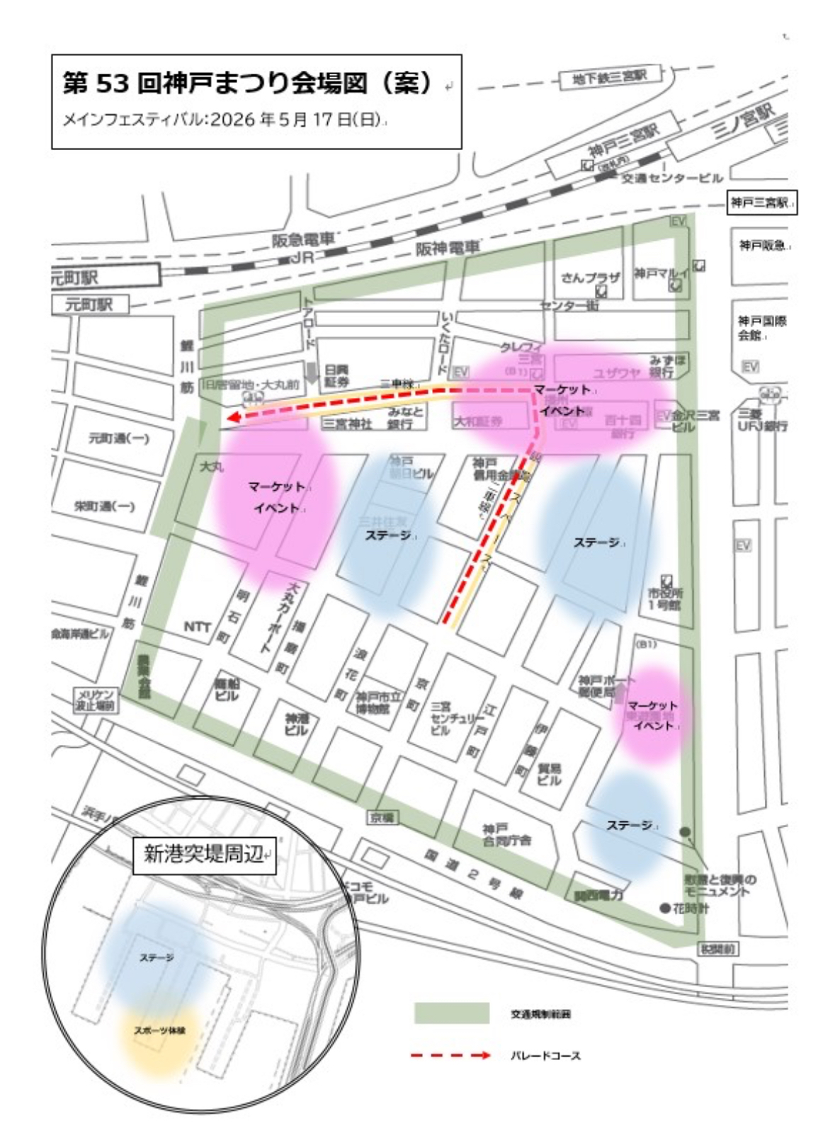 第53回神戸まつりは、三宮再整備による工事が本格化することにともない、歩行者・観客に対する安全性の確保が難しい一方、まちなかでのパレードを希望する声も大きいことから、パレードコースを京町筋へと移して実施します。またそれに伴い、従来のストリートイベントやステージ位置の調整が必要となるため、ウォーターフロントエリアも含めて会場を検討しています。
