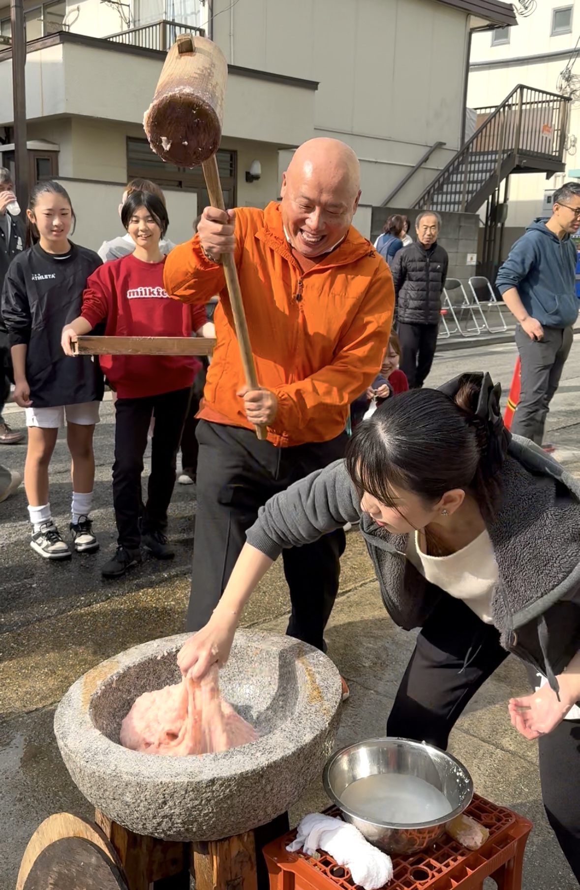 その後、重い杵を使って 90秒間の餅つきチャレンジ!