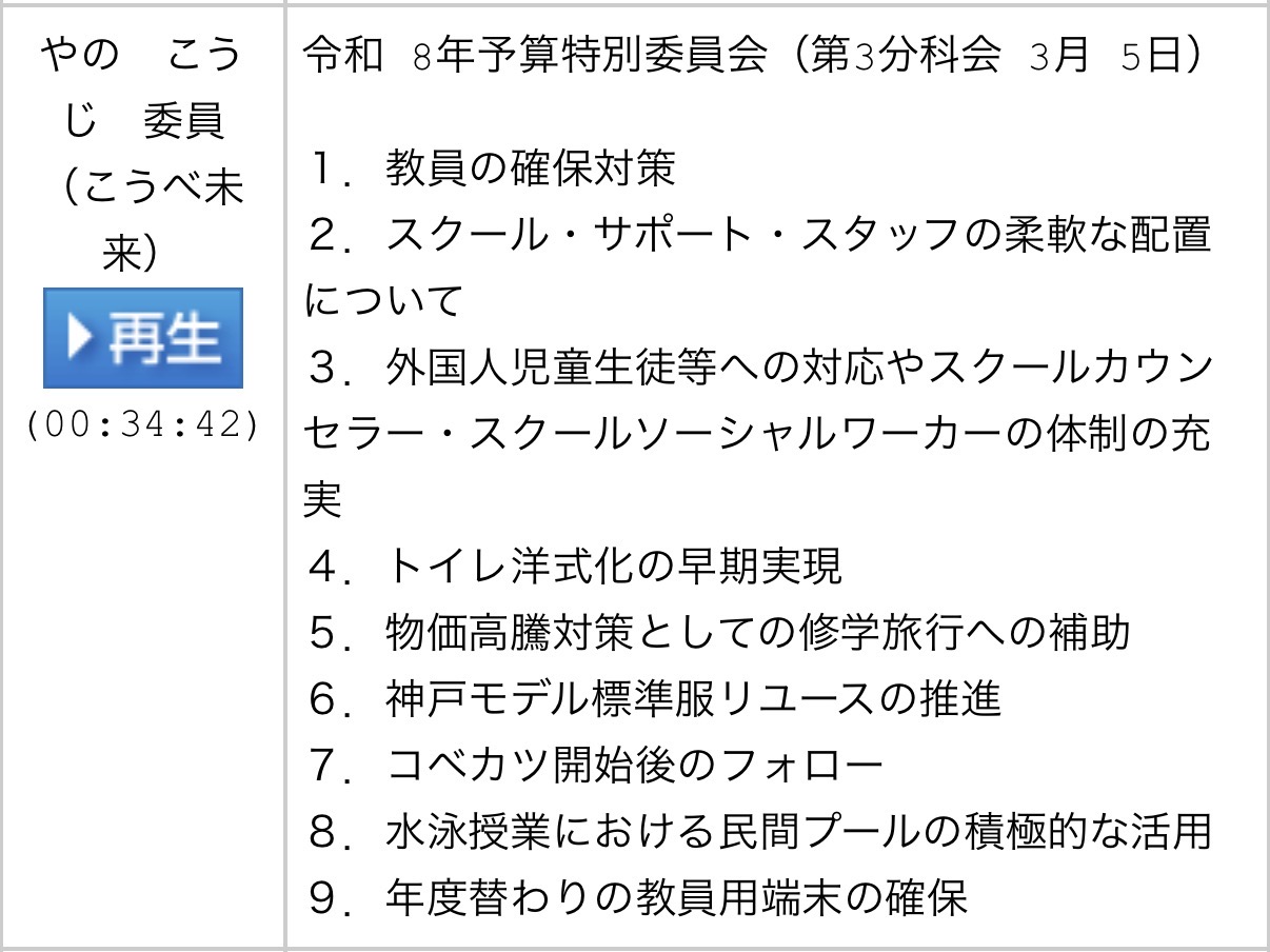 以下に質疑の内容を添付させていただきます。(神戸市教育委員会事務局からの答弁は質疑の動画からご覧ください)