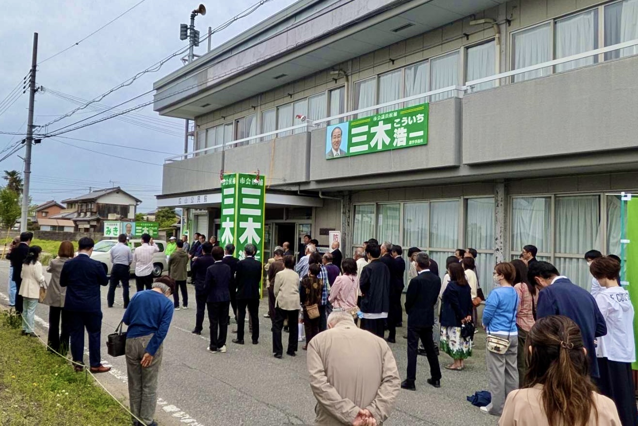 選挙事務所(公民館)の前には、三木さんの情熱とこれまでの歩みを支持する多くの市民の皆さまが参集され、熱気あふれる出陣となりました。