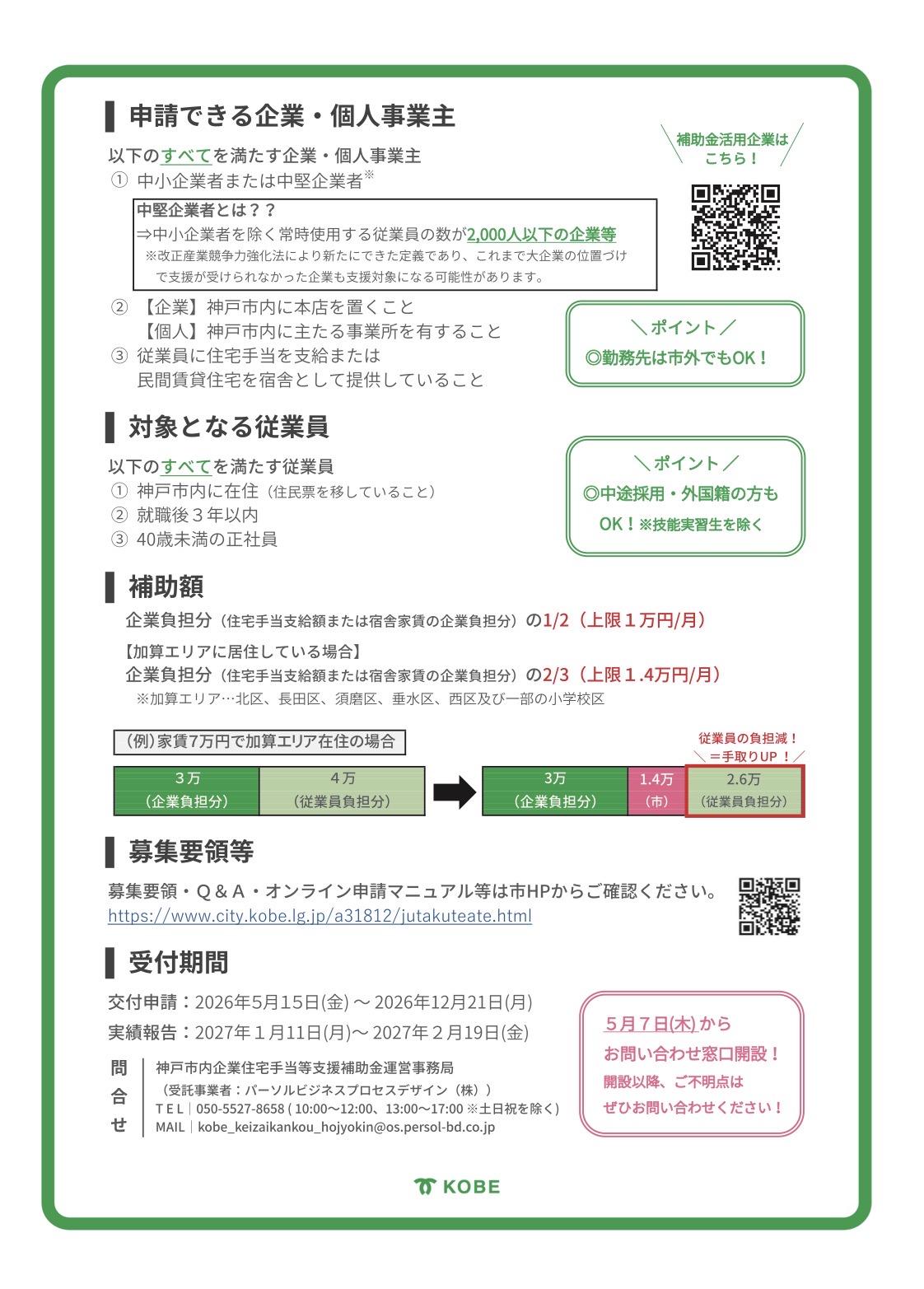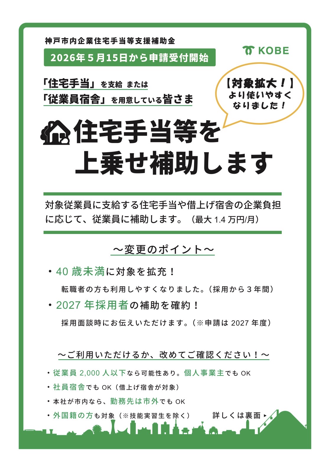 神戸市経済観光局経済政策課発「【5月15日申請受付開始】神戸市内企業住宅手当等支援補助金 ~こうべ「住む×働く」若者応援補助金~」の最新情報を、共有させていただきます。