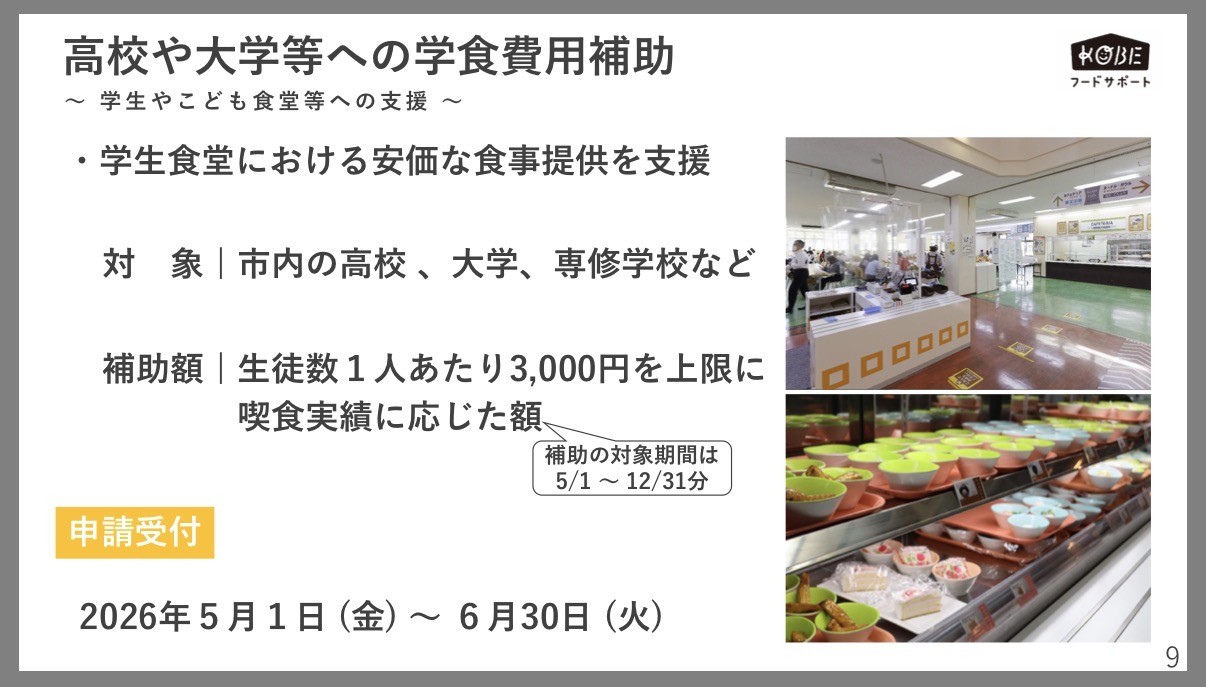 神戸市発「神戸市学生食堂を通じた学生等支援補助金」の申請受付開始情報を、共有させていただきます。