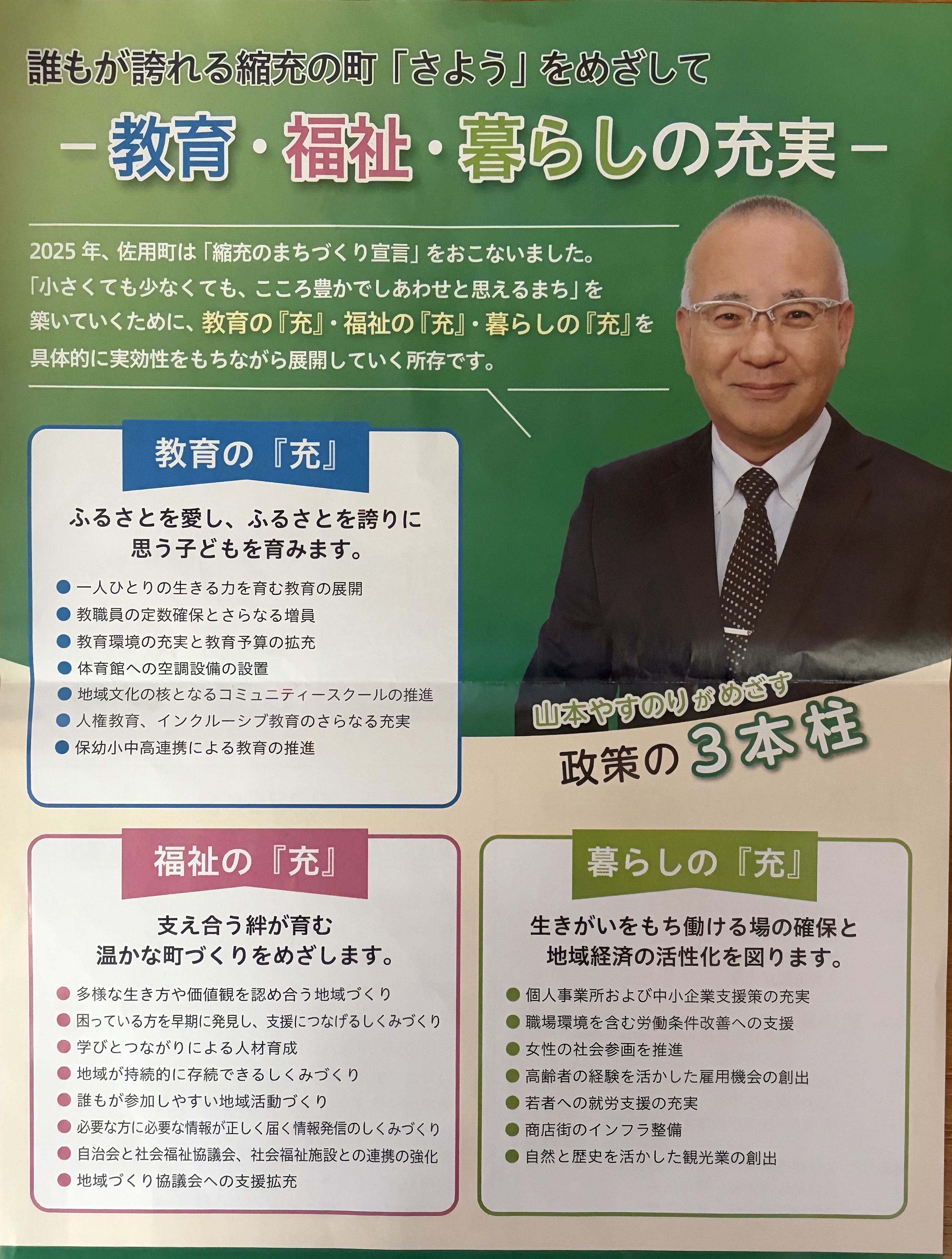 新しい佐用町をつくる即戦力、「山本やすのり」さんへ、皆さまの大きなお力添えを賜りますよう、心よりお願い申し上げます。