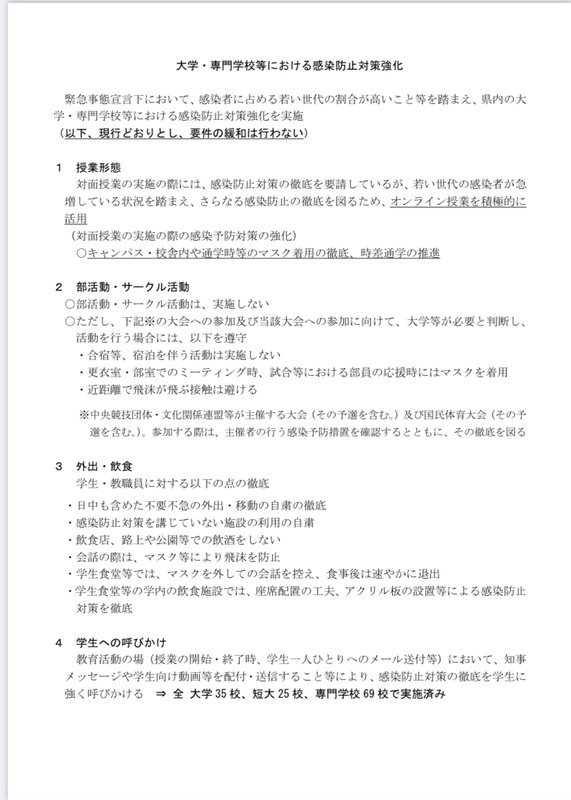 兵庫県の緊急事態宣言下において、感染者に占める若い世代の割合が高いこと等を踏まえ、兵庫県内の大学・専門学校等における感染防止対策強化を実施 (以下、現行どおりとし、要件の緩和は行わない)