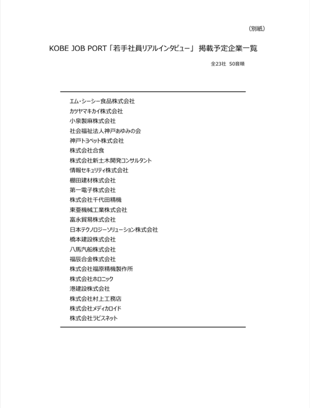 今回は「若手社員リアルインタビュー」として、神戸市内の様々な業種の若手社員の生の声に加えて取扱い製品やサービスなども紹介することで、若者にその企業を知ってもらい、その企業で具体的に働くイメージを持ってもらえる内容としました。