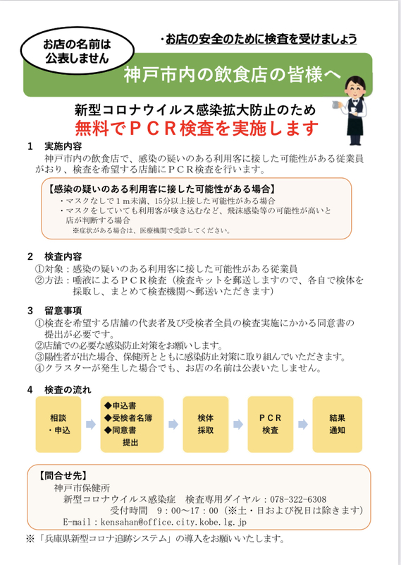 ・対象店舗:神戸市内の飲食店で、感染の疑いのある利用客に接した可能性がある従業員がおり、検査を希望する店舗