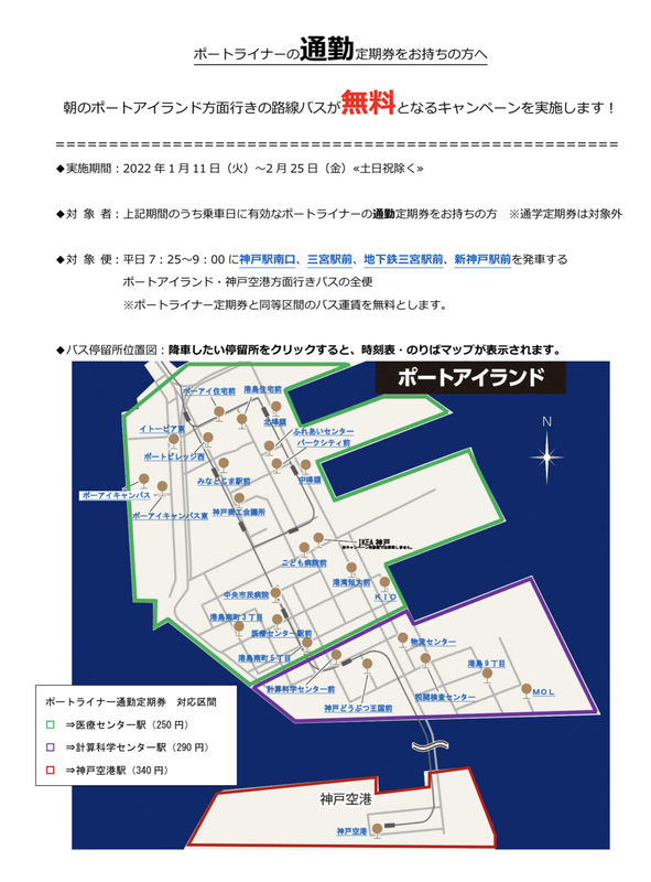 1️⃣ポーアイ方面“朝バス”無料キャンペーン~ポートライナー通勤定期券をお持ちの方へ~