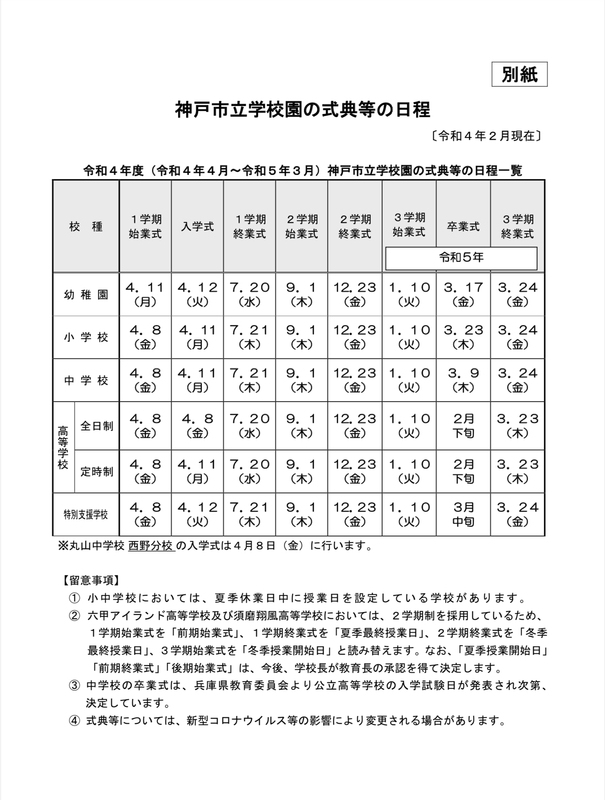 本日、神戸市教育委員会から、令和4年度神戸市立中学校の卒業式の日程を決定し、神戸市立学校園の式典等 一覧更新の報告を受けました。ご参考までに、以下にて情報を共有させていただきます。