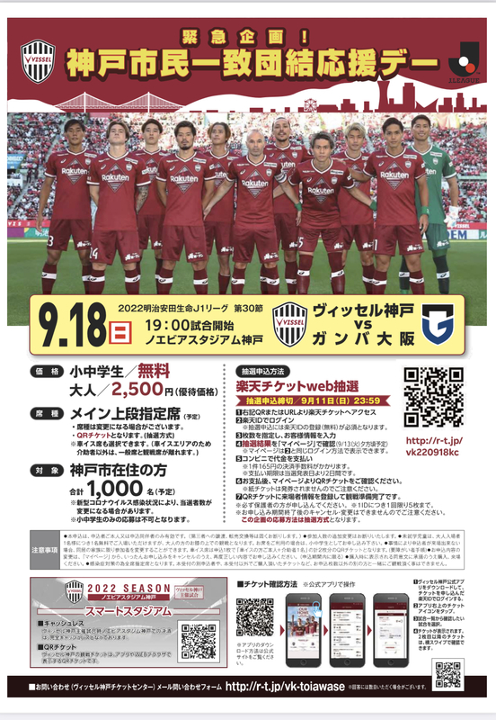 ヴィッセル神戸は、来たる9月18日(日曜日)に行われる「2022明治安田生命J1リーグ第30節 ヴィッセル神戸vsガンバ大阪(19時00分キックオフ/ノエビアスタジアム神戸)」にて、神戸市内に在住の方を対象とした「ヴィッセル神戸 神戸市民一致団結応援デー」を緊急開催することを決定しました。