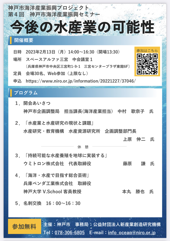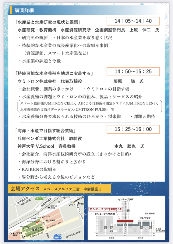 この度、水産養殖にテクノロジーを用いることで食糧問題と環境問題に取り組むスタートアップ企業・ウミトロン株式会社と、金属加工を中心とした事業からIT・映像制作・教育・海洋水産技術研究まで幅広い事業を展開する兵庫ベンダ株式会社をお招きし、「今後の水産業の可能性」をテーマとしたセミナーを開催します。さらに、国立研究開発法人 水産研究・教育機構 水産資源研究所にも「水産業と水産研究の現状と課題」について講演いただきます。