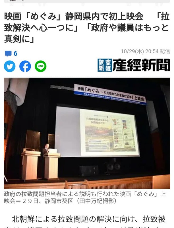 10月29日は県議会決算特別委員会の全体会。合間に会派の議員総会。終了後にドキュメンタリー映画「めぐみ」の上映会に拉致問題議員連盟の一員として参加しました。横田めぐみさんは私の2歳下で今年56歳、拉致されたのが14歳時です。アメリカ映画のため、日本ではほとんど報道されていない「家族会の自民党本部前での抗議集会のシーン(バカヤローコールの連発)」と「死亡報道の家族から、生還者に対して本当のことを言ってほしいとの厳しい発言のシーン」が再発見であり、印象に残りました。2002年の小泉総理の北朝鮮電撃訪問と生存者の生還、その後の混迷がまとめられているドキュメンタリー映画でした。