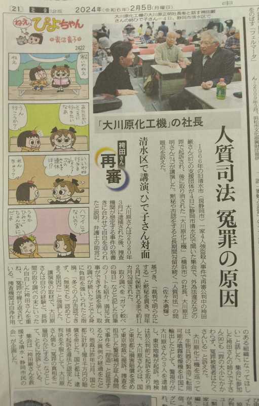 2/4は雨のためゴミ拾いジョギングはお休み。第一日曜日定例の地元富士見台2丁目自主防災・放水訓練も中止となりました。10時からは政策形成PT「女性と防災」の事務局会議(ZOOM)に参加。能登半島地震での避難所運営や女性役員のかかわり方の検証など今後の活動を確認しました。午後は清水に移動し袴田巌支援団体の集会に参加。2020年3月に社長ら3人が逮捕、1年以上の勾留後起訴が取り下げられた「大川原化工機不正輸出冤罪事件」の話を当事者である大川原正明社長から直接話が聞くことができました。勾留中がんが確認された相嶋静夫顧問は十分な治療が受けられずに亡くなっています。無罪である証拠の提示を受けても無視続けた検察の対応に大きな問題がある事件です。不起訴後の国家賠償訴訟で現職警察官が捏造ですねと証言している完全な冤罪事件です。袴田事件のようなかなり前の事件ではなく、2020年逮捕の事件です。袴田事件の静岡県警の冤罪をしっかり学習して、県政の場で質問していきたいと思います。