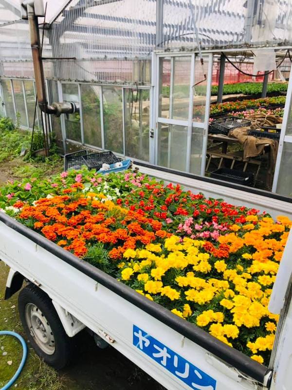 牛島自治会環境美化部の活動で明日植替えの為、近所の井上園芸さんに注文してあった花壇3カ所分のベゴニアとマリーゴールドを受取に。