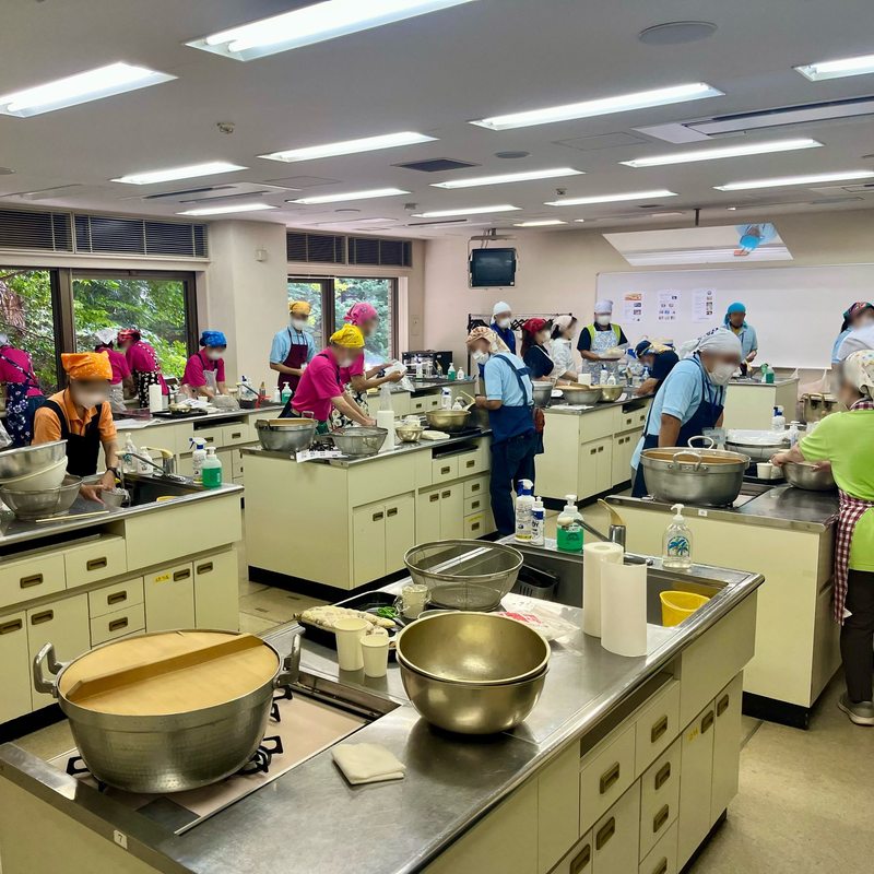 受講生の小学生が40名程度、学生・高校生・中学生などのリーダー、大人の青少対委員も加えると、かなりな人数になります。そのため、調理室だけでなく、諸室を使っての開催。こどもたちがこねたうどん玉を発酵させている間、一番広い集会室に戻り、トッピングを決めるレクをするなど、ホームの池上地区の皆さんのオペレーションは素晴らしかったです👏