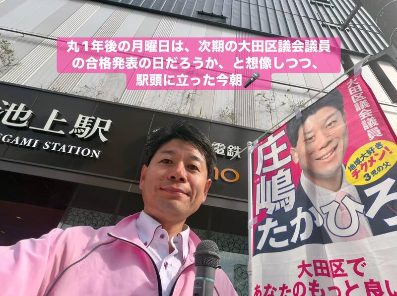 丸1年後の月曜日は、次期の大田区議会議員の合格発表の日だろうか、と想像しつつ、駅頭に立った今朝でした🎤
