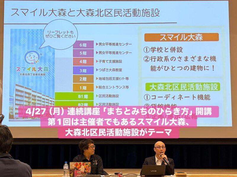4月27日(月)夜、連続講座「#まちとみちのひらき方」が開講▶️ スマイル大森(大森北四丁目複合施設)内の大森北区民活動施設が主催です。