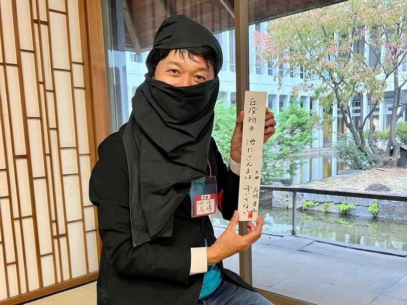 尾行の修行から始まり、合言葉「さんま祭りはどこですか❓」をもとに、さまざまな修行にチャレンジ。例えば、目黒区役所では、おてだま、手裏剣づくり(折り紙)、俳句などの遊びをクリアしました。