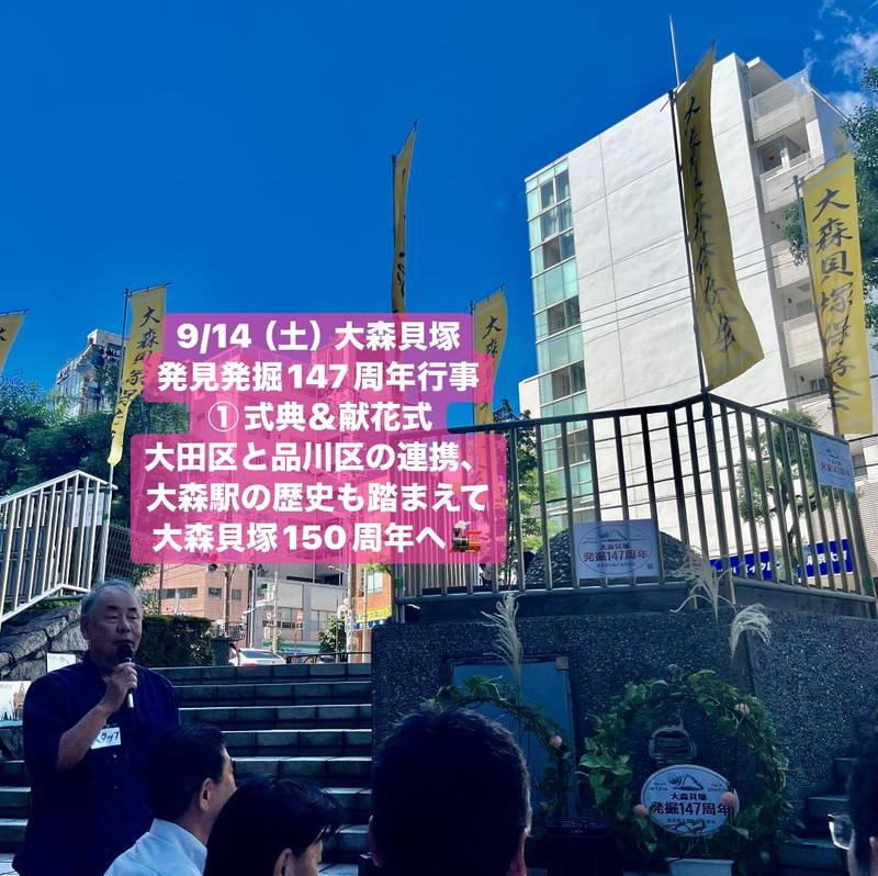 9月14日(土)、大森にとって大切な一日、#大森貝塚発見発掘147周年 の周年行事を、私も会員である #東京都大森貝塚保存会 の主催で行いました。午前は、式典と献花式💐 式典は、NTTデータ大森山王ビル前にて。