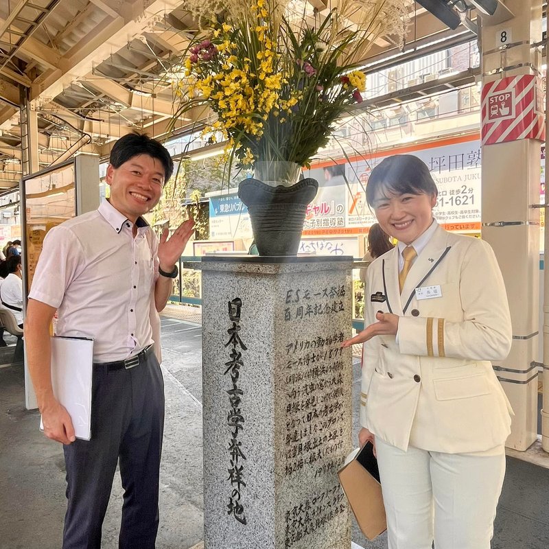 大森駅では、7月に着任されたばかりの駅長さんと一緒に記念撮影。1877(明治10)年のモースによる大森貝塚の発見発掘は、その前年1876(明治9)年に大森停車場が開業し、汽車が停まるようになったことからつながったといえます。つまり、2年後は、#大森駅開業150周年 ということですね🚂