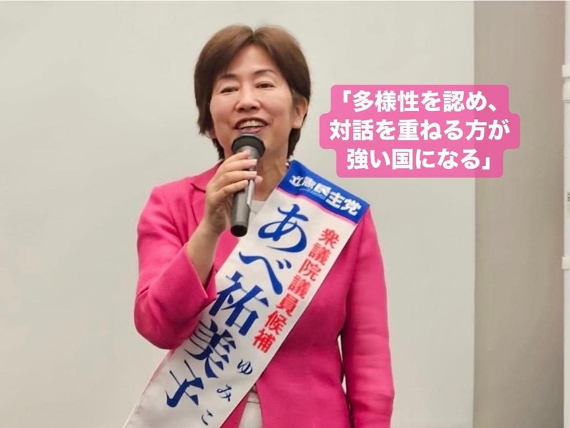 #あべ祐美子 候補の演説。今月で議員活動18周年を迎えましたが、子育てしながら新聞記者をしていた頃、まだ育児休業制度もなく、国の審議会でも「母親を甘やかすな」といった議論がまかり通っていた状況に対し、政治家を志したとの話からスタート。