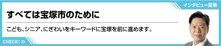宝塚には様々な課題が山積しています。課題を解決する為に大切なのは「宝塚と県や国をつなぐ力」だと考えております。育てていただいた宝塚市を住み続けたい街、誇れる街にしたい。そんな想いで宝塚を前に進めて参ります。