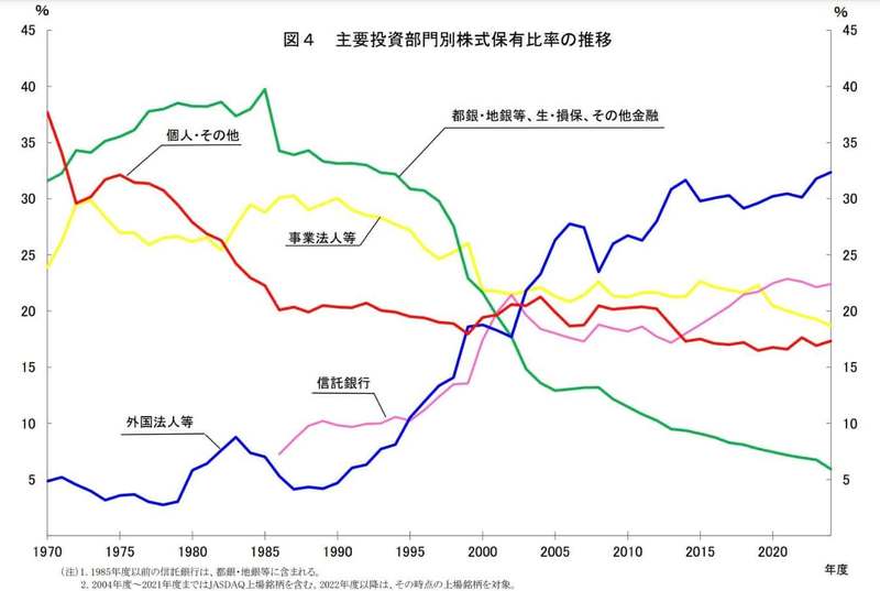 逆に都銀や地銀、事業会社の比率が下がっているのは、「株式持ち合い」の解消を意味している。