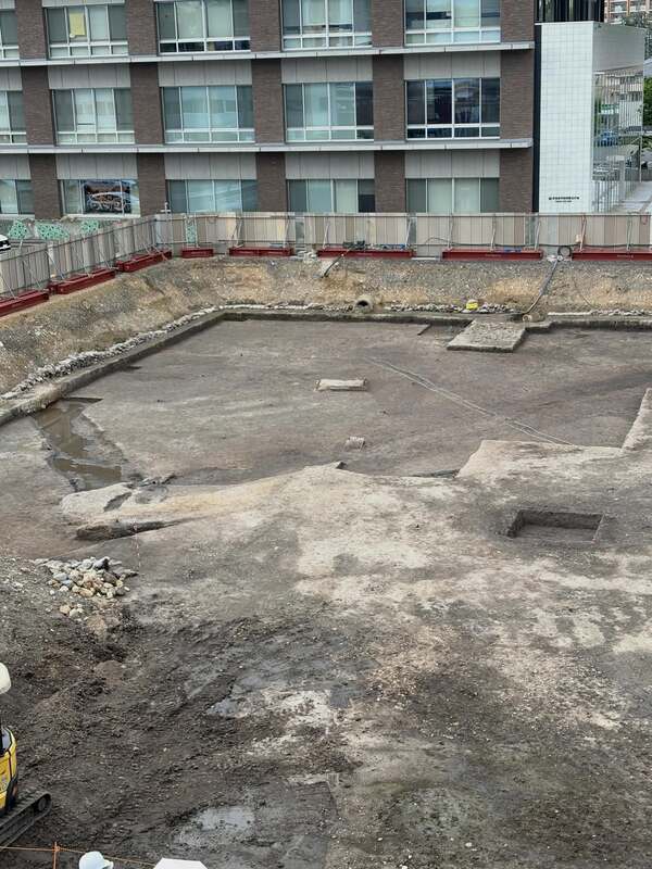 第15次発掘調査地点は、第10次調査地点と第14次調査地点の間に位置します。西側の第10次調査地点では古代の竪穴住居跡などの遺構が複数基発見されていますが、第15次調査地点では現在のところ古墳時代と近代の溝状遺構が僅かに2基発見されたのみです。遺構を検出した地面の観察から、住居を造るには適していなかったと土地と考えられます。第15次調査地点東側の第14次調査地点では、第15次調査地点同様に住居跡などは発見されておらず、古墳時代の溝状遺構とその上層から近世~近代の溝状遺構が確認されています。