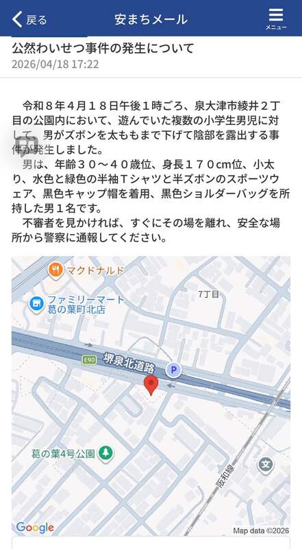 令和8年4月18日午後1時ごろ、泉大津市綾井2丁目の公園内において、遊んでいた複数の小学生男児に対して、男がズボンを太ももまで下げて陰部を露出する事件が発生しました。