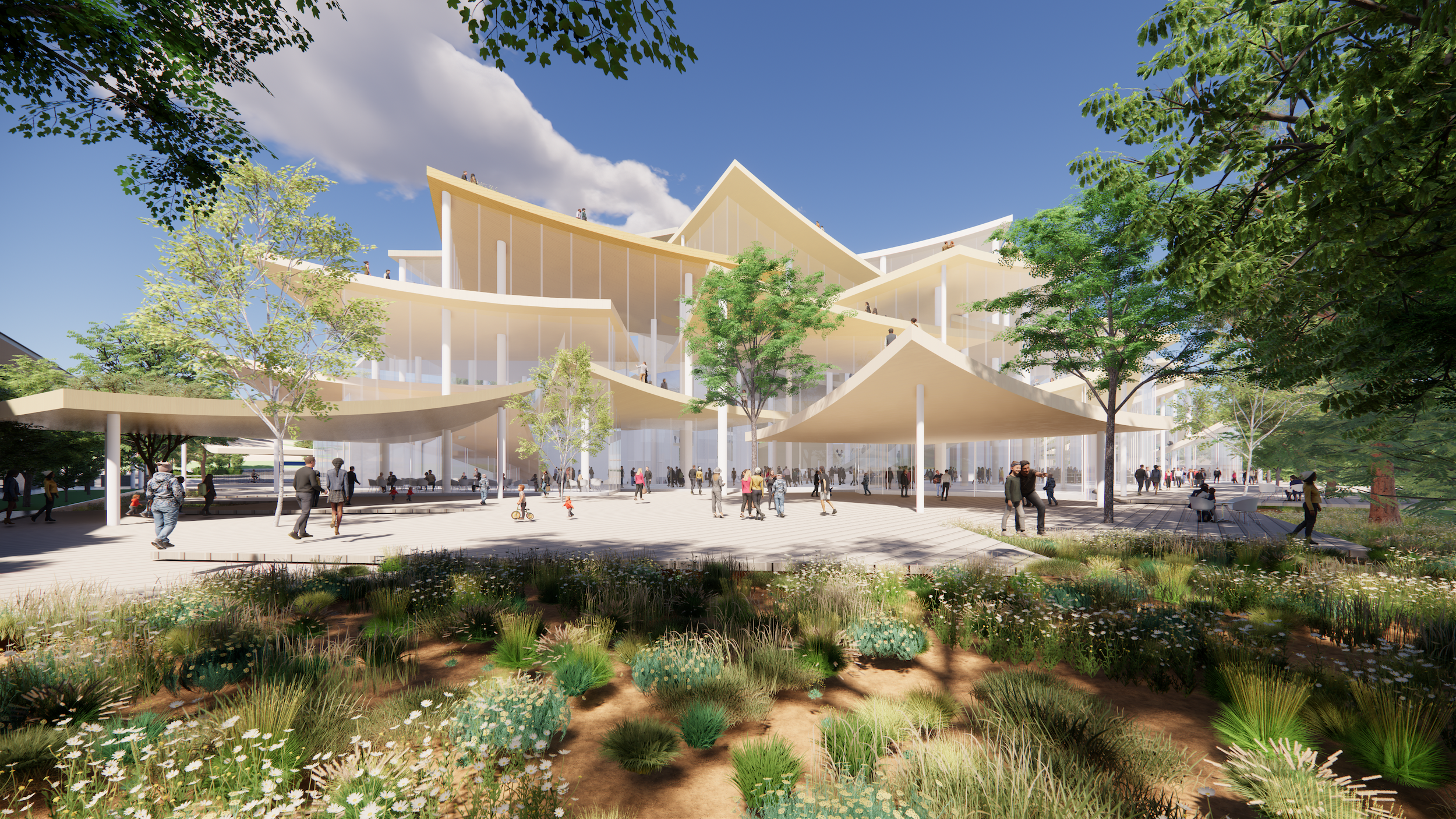 ↓は設計者選定の際に提案された、多くのプレートで構成された複合施設の開放的なデザイン。