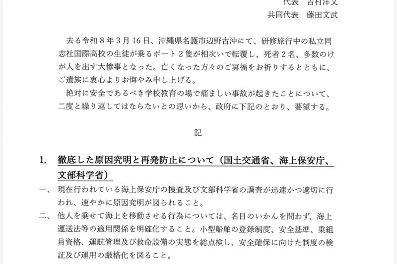 本日夕刻、首相官邸において官房長官に「名護市辺野古転覆事故に関する提言」をお渡しさせて頂きました。 官房長官からは、文科省による学校法人に対する現地調査が近く行われる旨、発言がありました。 我が党も、関係各省と連携し、原因究明に万全を期していきます。 #日本維新の会