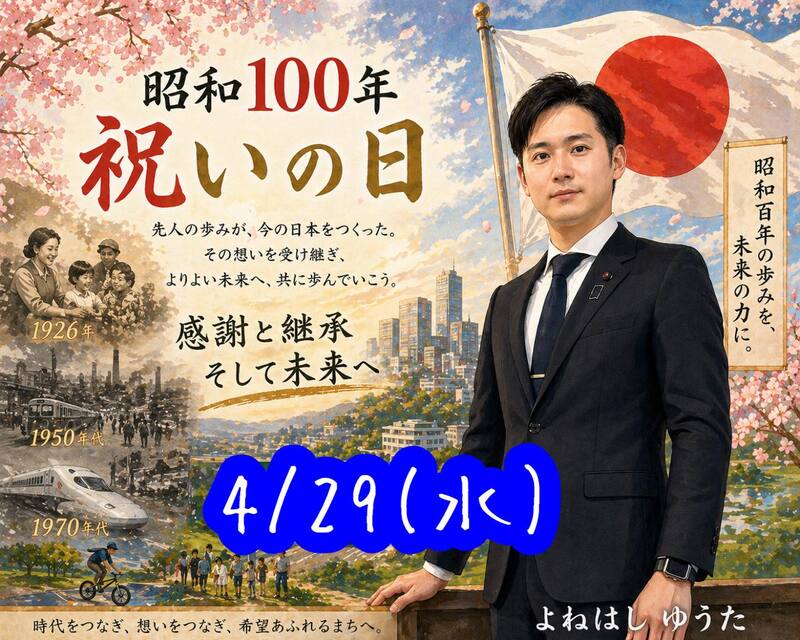 国民の祝日であります「昭和の日」を迎えました。昭和100年という節目にあたり、時代を切り拓いてこられた先人の皆様に、深い敬意と感謝を申し上げます。戦後の復興、高度経済成長、そして地域社会の礎づくり。激動でありましたその一つひとつの積み重ねが、こんにちの私たちの暮らしを支えています。先人の歩みに想いを馳せ、その志を受け継ぎながら、これからの時代を担う責任を胸に刻み、今と未来に資するまちづくりに、真摯に取り組んでまいります。