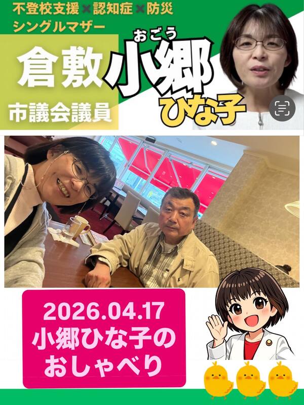 ホーム>政党・政治家>小郷 ひな子 (オゴウ ヒナコ)>【小郷ひな子のおしゃべり】2026.04.174月17日、倉敷市内のお店で、「小郷ひな子のおし...