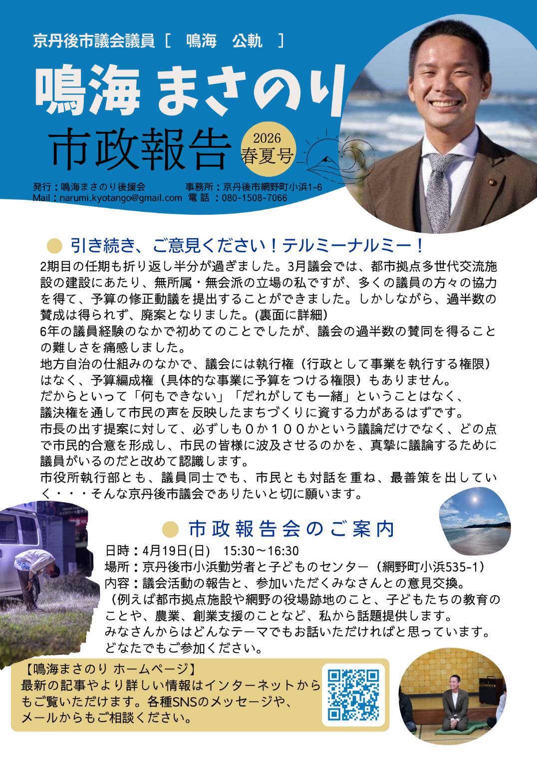 ホーム>政党・政治家>鳴海 まさのり (ナルミ マサノリ)>【京丹後市議会】鳴海まさのり市政報告のご案内