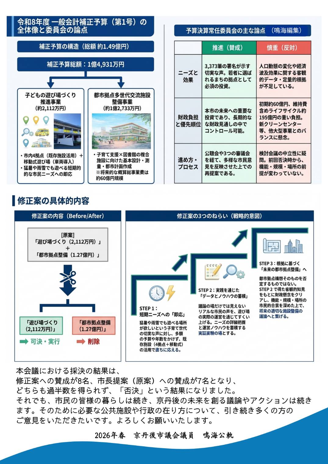 2期目の任期も折り返し半分が過ぎました。3月議会では、令和8年度予算に加え、都市拠点多世代交流施設の建設にあたり、無所属・無会派の立場の私ですが、多くの議員の方々の協力を得て、予算の修正動議を提出することができました。