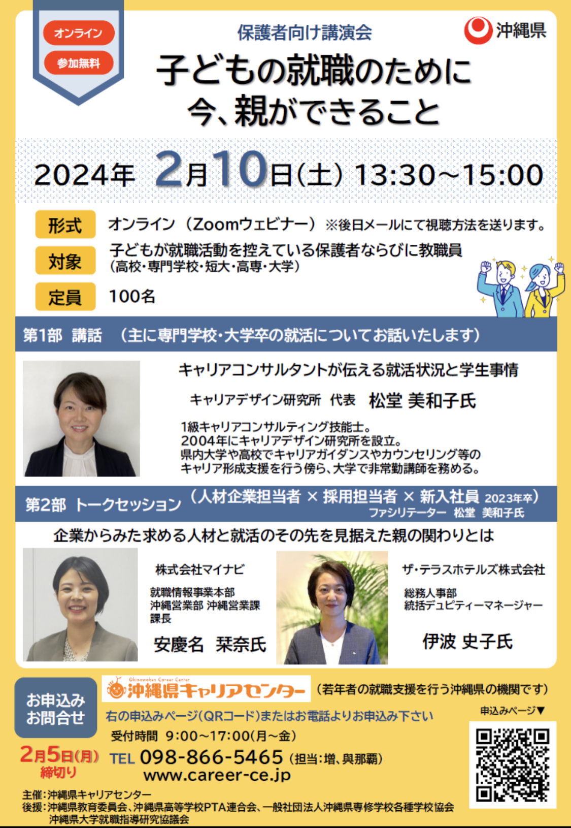 沖縄県キャリアセンター主催で、保護者向け講演会を行います。