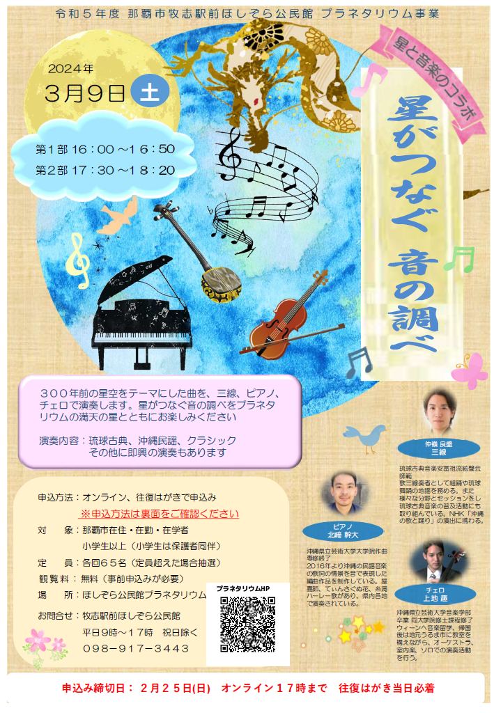 300年前の星空をテーマにした曲を、三線、ビアノ、チェロで演楽します。星がつなぐ音の調べをプラネタリウムの満天の星とともにお楽しみください