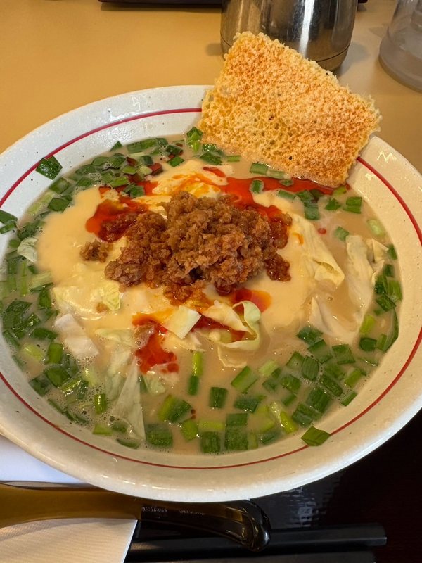 担々麺の上にキャベツと濃厚チーズソースがかかり、さらにカリカリのチーズ焼きが添えられた逸品。