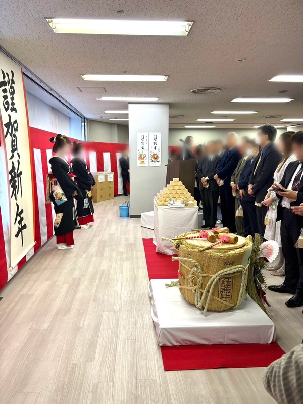 日本橋小舟町の鏡開きには、毎年お伺いさせていただいています。160年前、安田善次郎が、みずほ銀行の前身である安田銀行をこの小舟町に開いたことにちなんで、毎年みずほ銀行小舟町支店内で町会の鏡開きが行われるという、少し珍しい例です。頭取をはじめとする銀行の重役の方々も来られ、今年も大勢の方が集まっておられました。