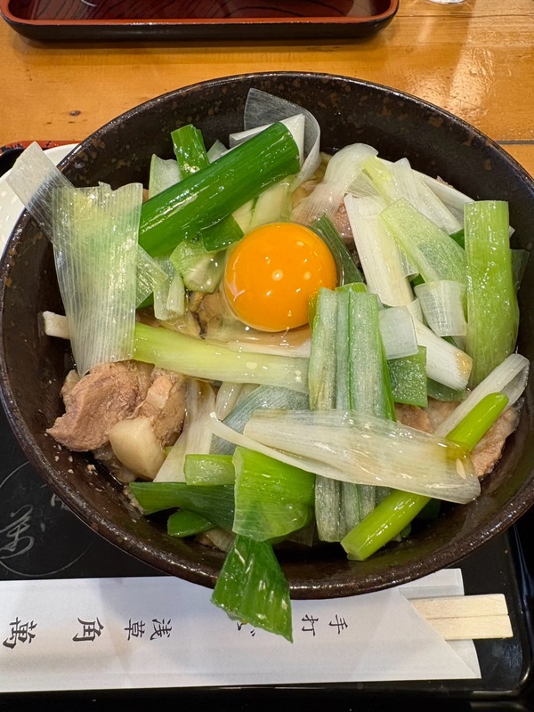 今回はこちらでも「冷やし肉南蛮」を注文。肉・ネギ追加に玉落としを加えました。