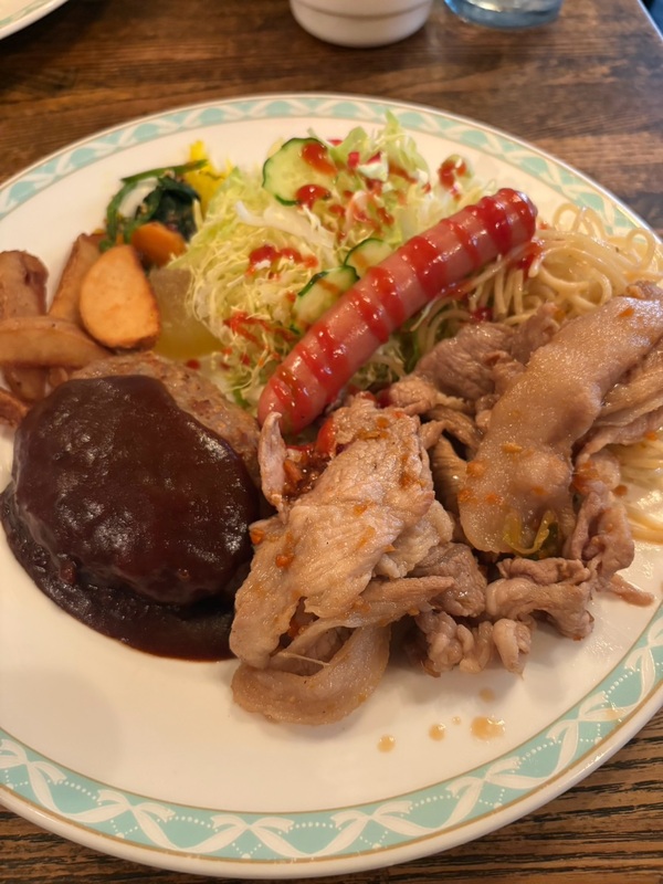 ハンバーグに生姜焼き、ソーセージとサラダが乗った「肉々プレート」をいただきました。さまざまな味をワンプレートで楽しめる、ボリュームたっぷりの一皿でした😄