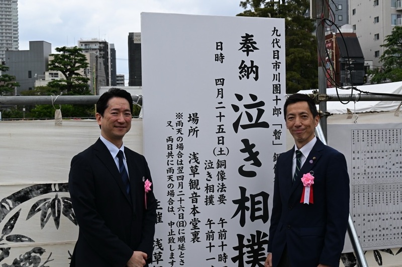 九代目市川團十郎「暫(しばらく)」像の復元(1986年)を記念して、1991年から続いているこの行事。力士(組ませ役)に抱えられた赤ちゃんの泣き声の大きさを競うもので、毎年各地から健康を祈願する多くのご家族が参加されます。