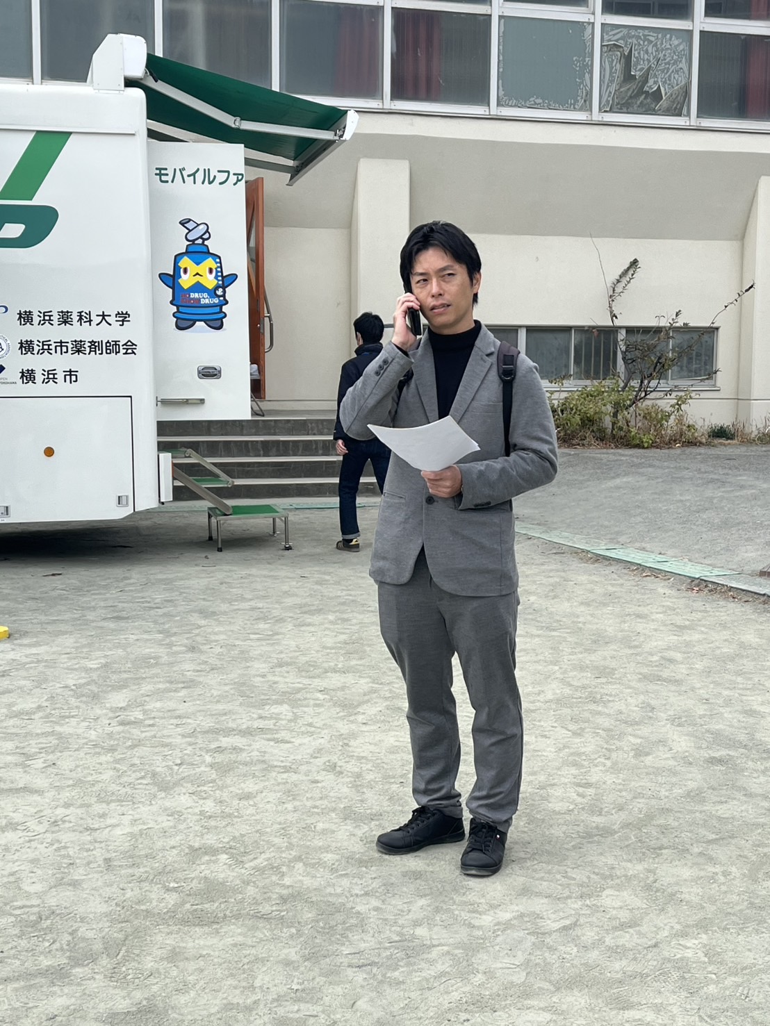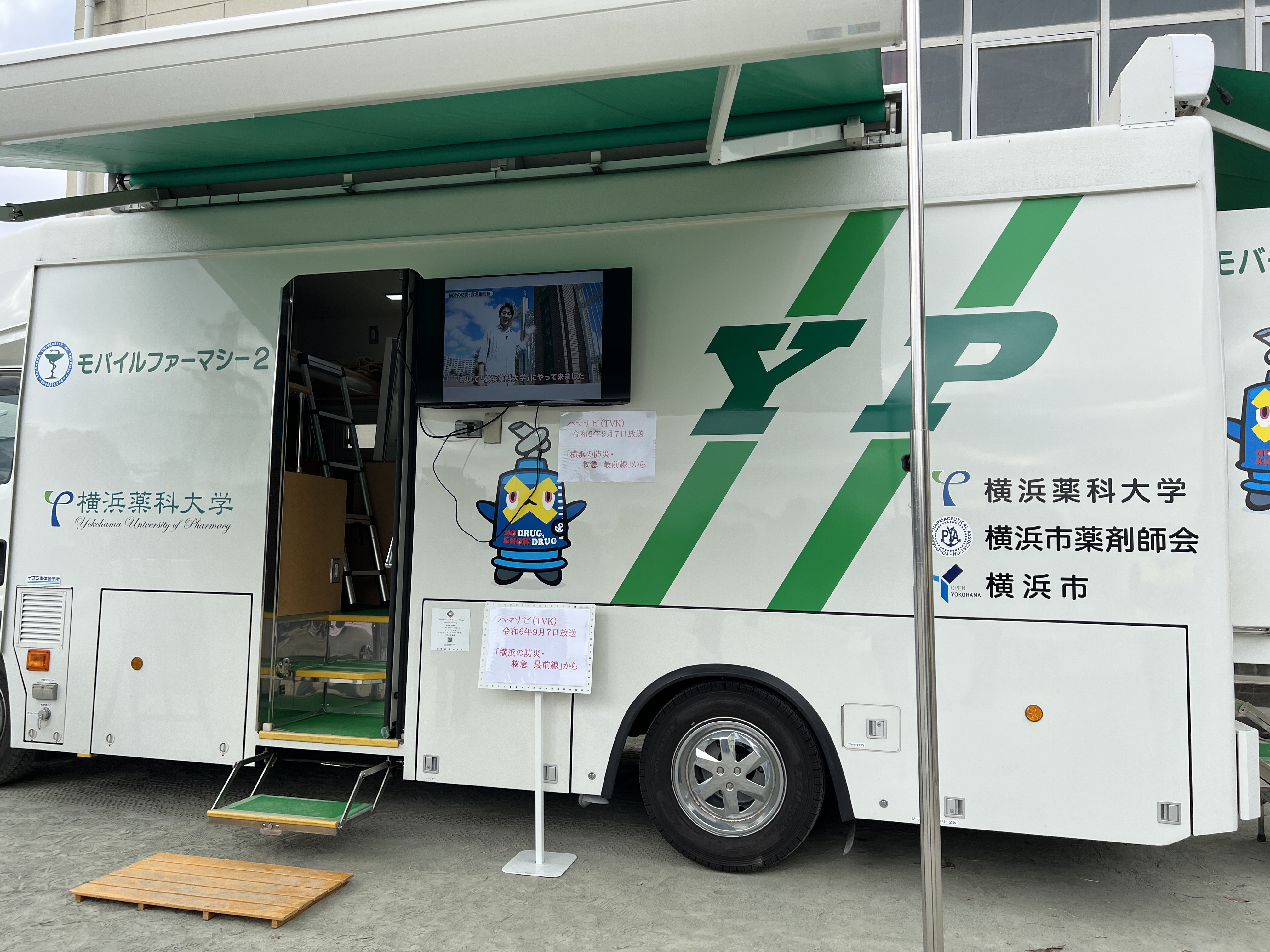 横浜薬科大学によるモバイルファーマシー(移動薬局)の展示と説明があった。日本で25台あり、被災地で大活躍!きっかけは東日本大震災、薬があっても薬剤師がいない・薬剤師がいても薬がない、薬を乗せたモバイルファーマシーが薬剤師を最大4名乗っけて駆けつけることで対応が可能に。