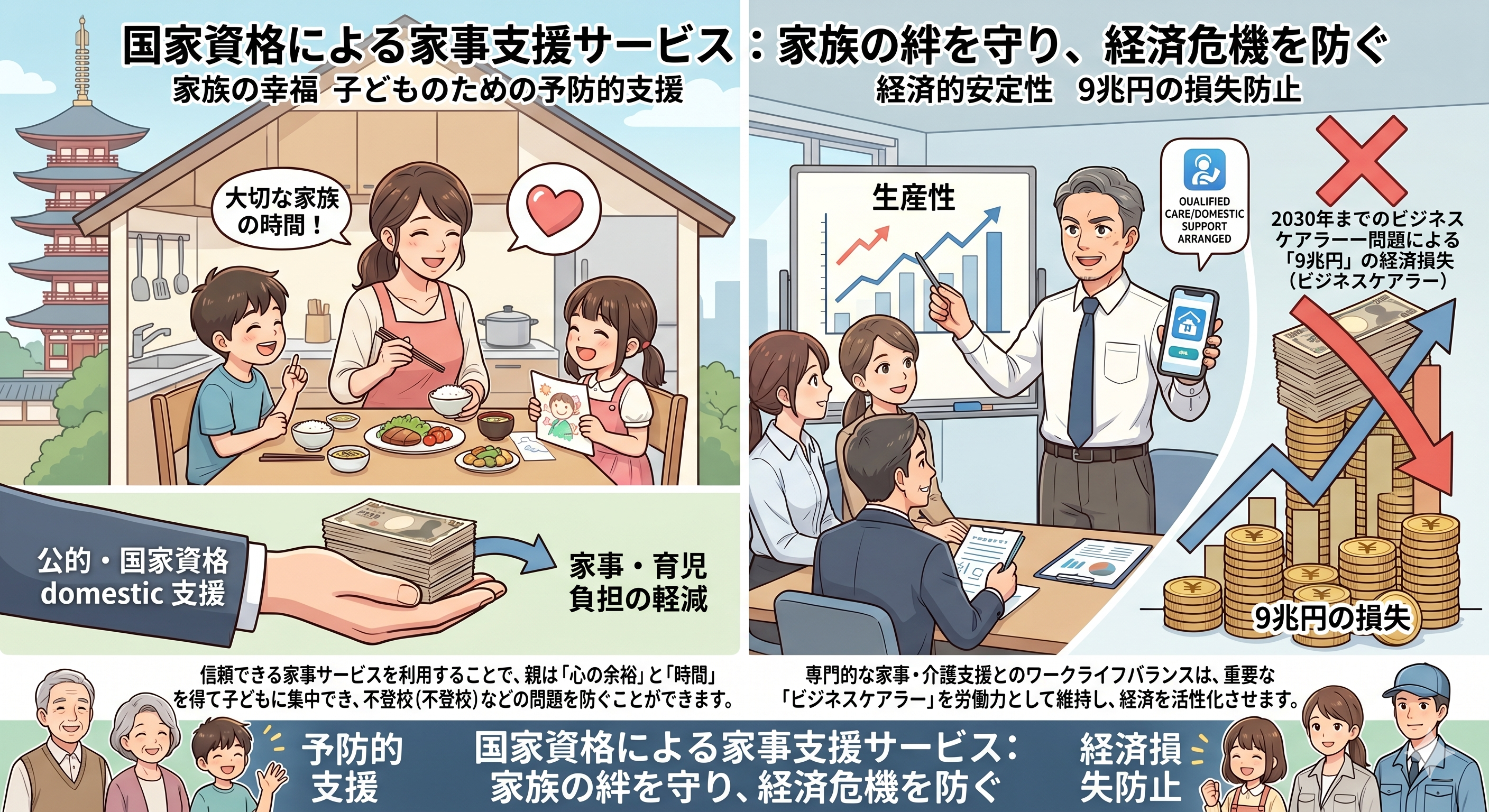 働き盛りの中間管理職が、介護や家事の負担で第一線を退かざるを得ない状況は、日本経済にとって計り知れない打撃です。「育児・不登校」と「介護」。この二つの大きな課題が重なる「ダブルケア」の世帯をどう支えるかが、今まさに問われています。