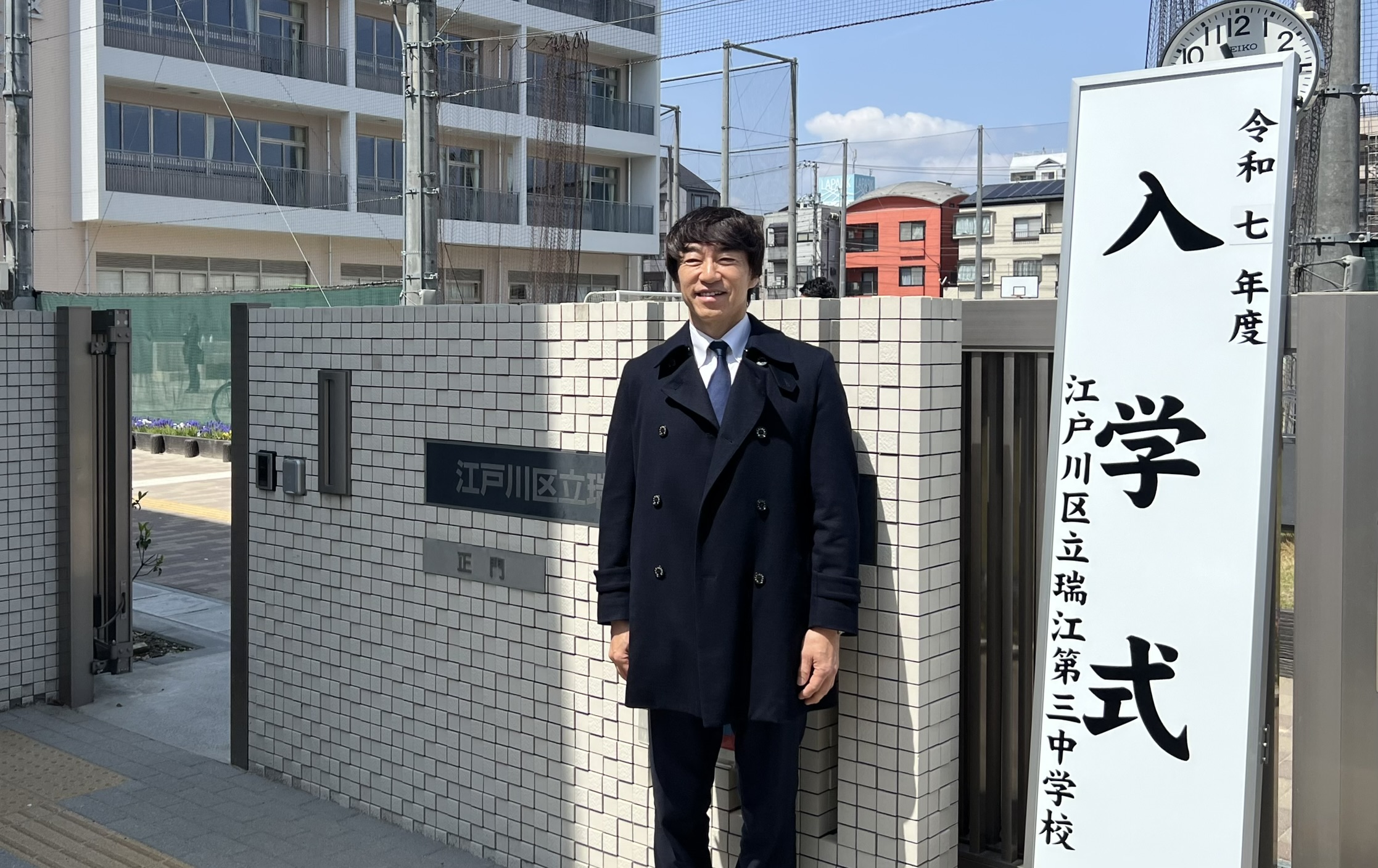 私は瑞江地区で育った者であり、江戸川区立瑞江第三中学校に約50年前に入学し、卒業生であることから、入学式については、今回、区議会議員として瑞江三中の入学式に来賓として出席させていただきました。また、瑞江三中の同期の卒業生で瑞江地区の青少年のために活動している友人も来賓として来ていて、会うことができました。