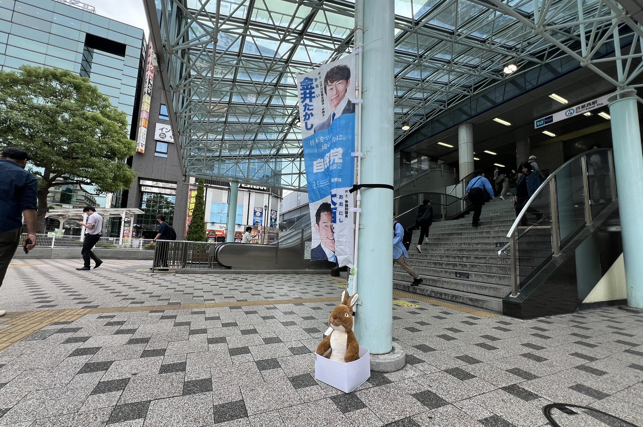 西葛西駅北口ロータリーでは、「応援しています」とお声掛けをしてくださった方がいらっしゃって、また、高齢の方お二人が「ウサギがかわいい!」と言って、区政報告リーフレットとウサギの名刺を受け取ってくださいました。