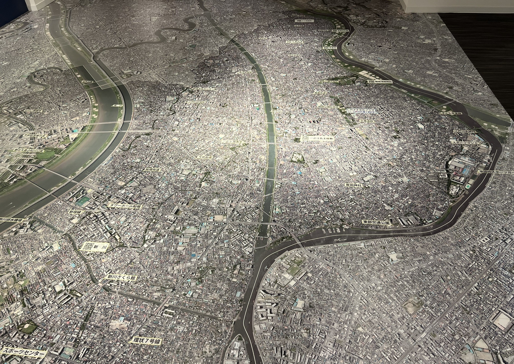入室してまず目に入るので、注目してほしいのは、床一面に広がる巨大な航空地図です。江戸川区全域を俯瞰できるこの地図の上を歩くと、自分の住む街や馴染みの場所を改めて発見する楽しみがあります。