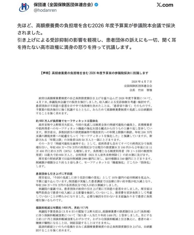 高額療養費負担増は、世界に誇る日本の国民皆保険制度の破壊。
