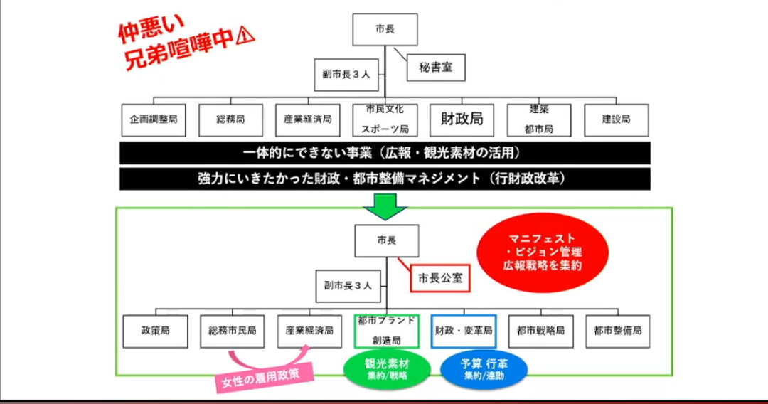 そして、前市政から要望していて、新市政になって実現したことで嬉しかったこと。縦割り行政を打破するために、大きく改正された市役所の組織についても詳しく解説します。