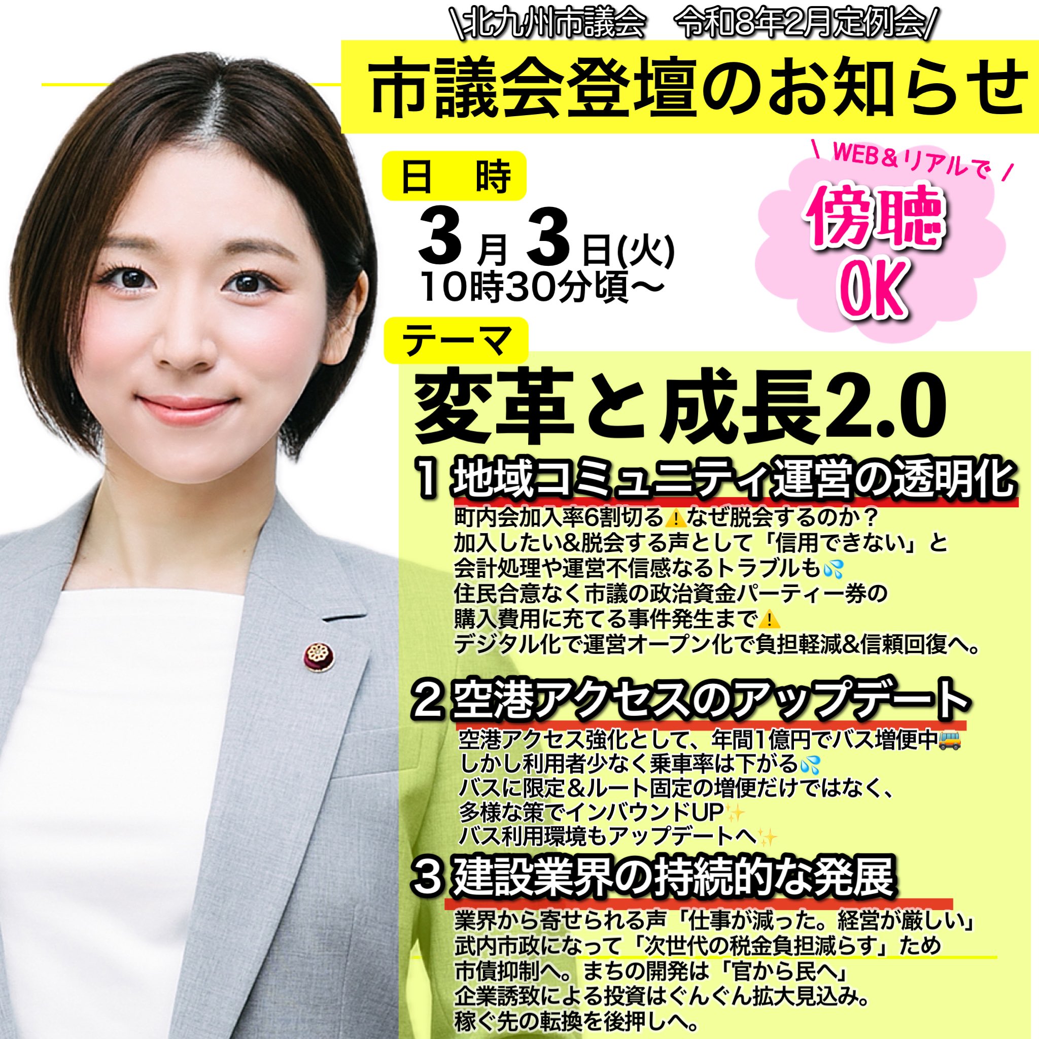 ホーム>政党・政治家>井上 じゅんこ (イノウエ ジュンコ)>【北九州市議会】〈アーカイブ配信中!〉3月3日登壇します!地域コミュニティや空港アクセスなど